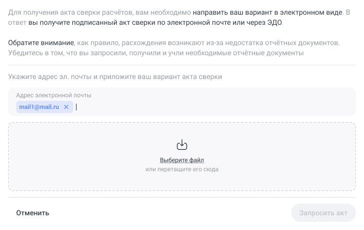 В открывшейся форме укажите один или несколько адресов электронной почты, а также загрузите ваш вариант акта. Перед оформлением запроса убедитесь, что вы получили все необходимые отчётные документы по оплаченным счетам и заказам.