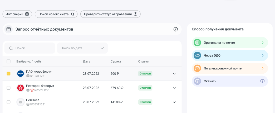После авторизации, вы увидите все оплаченные вашей организацией счета: